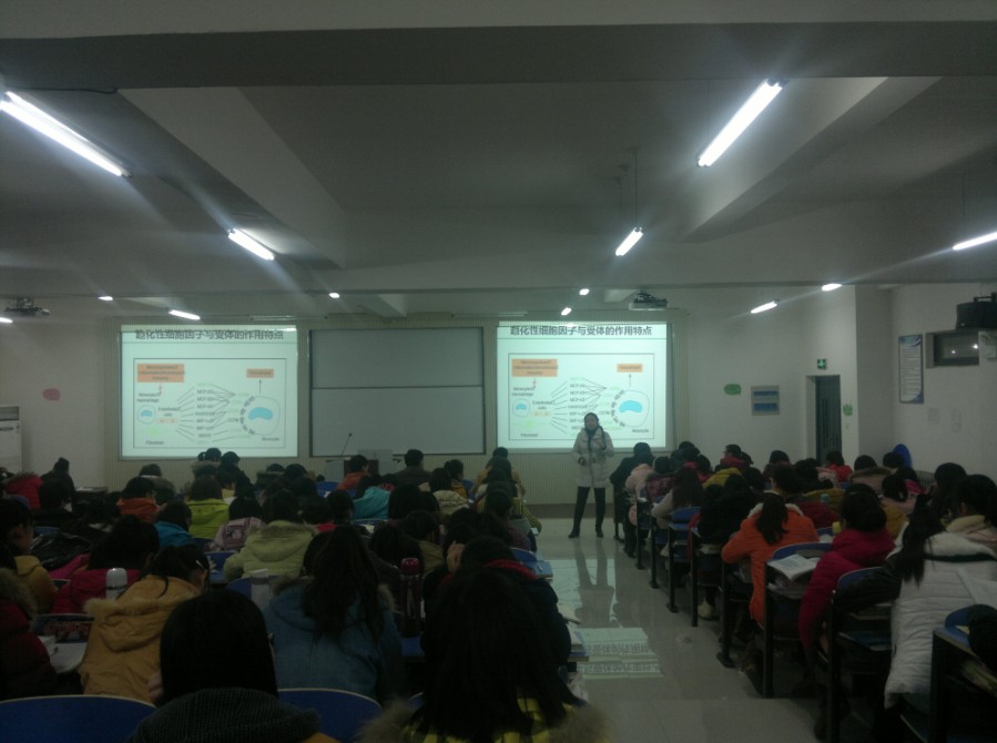 精彩不断,喝彩连连。"与名师相约,与未来牵手"系列讲座之武汉大学篇,于12月23日晚,在平原校区第一教学楼B202成功举办。本次讲座以“趋化性细胞因子受体与白血病的相关研究”为题,由武汉大学张秋萍教授担任主讲,我院免疫学教研室老师及400余名学生共同聆听了此次讲座。
