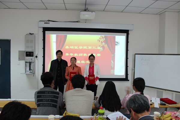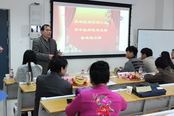 为提高我院中青年教师整体教学水平,并选拔优秀人才参加三全学院第四届青年教师教学竞赛,基础医学院在4月28日上午8:20基础楼B403教室,继双语组总决赛之后,隆重举办基础医学院第三届中青年教师教学竞赛普通组总决赛暨教学竞赛的颁奖仪式。本次总决赛的评委为校督导组组长杨文亮教授、督导组成员刘巨源教授、岳莜萍教授、护理学院院长薛松梅教授、三全学院教师发展中心主任李东亮教授等。