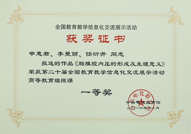 在三全学院挺进全国决赛的3件作品中,我院张金、胡亚平、董丽的《Primary cell》以其独特的中英文教学设计、流畅的画面音效荣获高等教育微课组一等奖;而另一件作品是申惠君、李曼丽、任衍开的微课《胸膜腔内压的形成及生理意义》,该作品在巧妙融合自身专业特色的基础上以其独到的视角,精心的构思也荣获高等教育微课组一等奖。