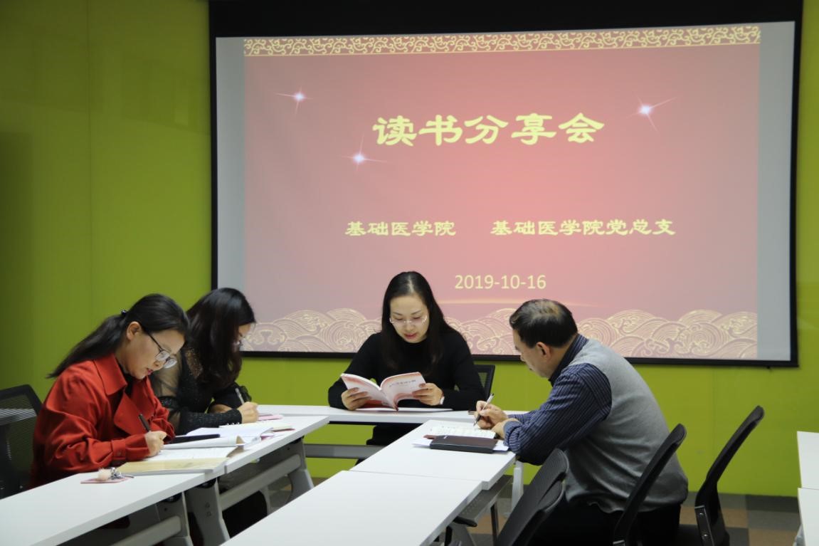 1016日下午,基础医学院党政班子成员在基础楼A304共享学习空间召开读书分享会。分享会由基础医学院党总支书记王俊萍主持,基础医学院党政班子成员杨保胜、李勇莉、苗莹莹参加了分享。