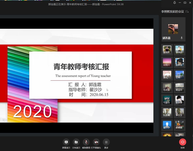 根据《新乡医学院三全学院青年教师系统化培养方案》(院人〔2017〕4号)文件精神,结合疫情防控需要,经向学校教师发展中心报备并同意,我院于6月15日上午通过企业微信在线汇报的形式,组织开展了2019-2020学年青年教师系统化培养考核工作。教师发展中心李东亮教授、考核组专家评委3人、及我院全部在培青年教师及导师参加了本次考评会议。