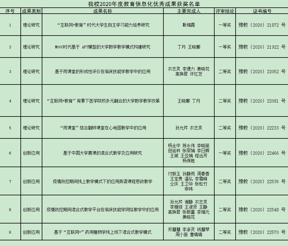 近日,河南省教育厅发布《关于公布2020年度河南省教育信息化优秀成果奖获奖名单的通知》(教科技〔2020〕332号),经过基础医学院遴选,学校审核推荐,我院生化教研室的杨全中老师的《基于中国大学慕课的混合式教学及应用研究》荣获创新应用成果类一等奖。