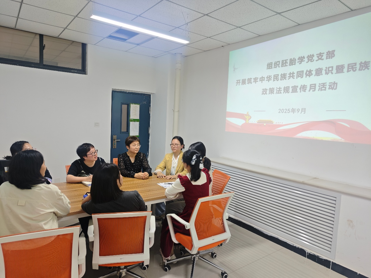 根据中共河南省委宣传部、河南省民族宗教事务委员会《关于在全省高校开展铸牢中华民族共同体意识暨民族宗教政策法规宣传月活动的通知》文件精神,为深入贯彻落实学校关于“铸牢中华民族共同体意识暨民族宗教政策法规宣传月”的工作部署,切实提升支部党员对民族宗教政策法规的理解与践行能力,9月29日,组织胚胎学党支部在励学楼A313开展了铸牢中华民族共同体意识暨民族宗教政策法规宣传专题学习会议。会议由党支部书记党珊同志主持,支部全体教师参加。
