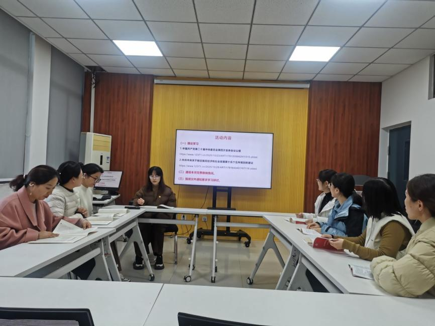 会上,支部书记李静首先带领支部成员研读了《中国共产党第二十届中央委员会第四次全体会议公报》及中共中央关于制定国民经济和社会发展第十五个五年规划的建议,深入分析了我国发展取得的重大成就,面对错综复杂的国际形势,以习近平总书记为核心的党中央带领全国各族人民,迎难而上、砥砺前行。在交流发言环节,胡亚平同志表示,学习后,更加明确在思想上要对标对表,要把学习全会精神作为当前和今后一个时期的重要政治任务,持续学、深入学,确保自己的思想和行动始终与党中央的要求同频共振。翟沙沙表示,学习后,更加明确在行动上要敢于担当,要立足本职岗位,找准工作与全会部署的结合点,加强思想政治工作的体系化建设,不能仅停留在单一课程,而要将思想政治教育“融入”人才培养全过程、各环节,构建“三全育人”(全员、全程、全方位育人)的大格局,推动党的创新理论进教材、进课堂、进学生头脑。郭连霜表示,要立足培养“听党话、跟党走”的时代新人。高校培养的人才,不仅要具备专业知识,更要具有坚定的理想信念、深厚的家国情怀和担当民族复兴大任的使命感。这要求高校在价值观塑造上投入更多精力,引导学生树立正确的世界观、人生观、价值观。大家纷纷表示,要积极响应全会号召,更加紧密地团结在以习近平总书记为核心的党中央周围,为基本实现社会主义现代化而共同奋斗,不断开创以中国式现代化全面推进强国建设、民族复兴伟业新局面