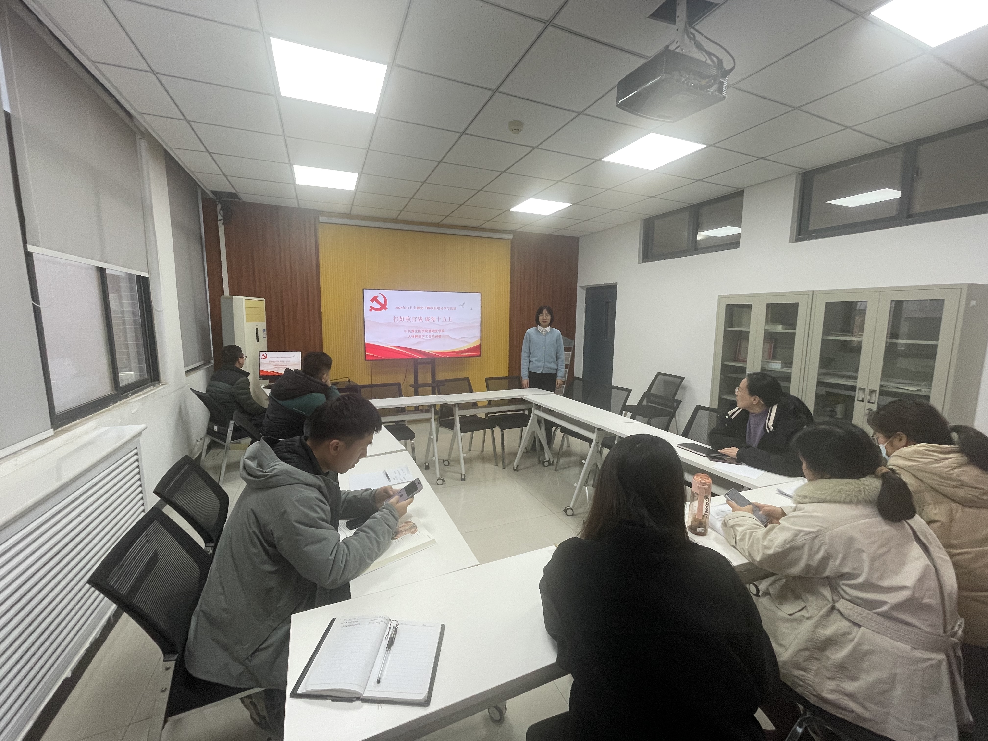 为深入学习贯彻党的创新理论,全面贯彻新时代党的建设总要求,扎实推进党支部标准化规范化建设,充分发挥基层党组织战斗堡垒作用和党员先锋模范作用,12月16日下午,基础医学院人体解剖学党支部在励学楼A315召开“打好收官战 谋划十五五“主题党日活动暨政治理论学习,本次活动由党支部书记苗莹莹主持,支部全体党员教师及入党积极分子参加。