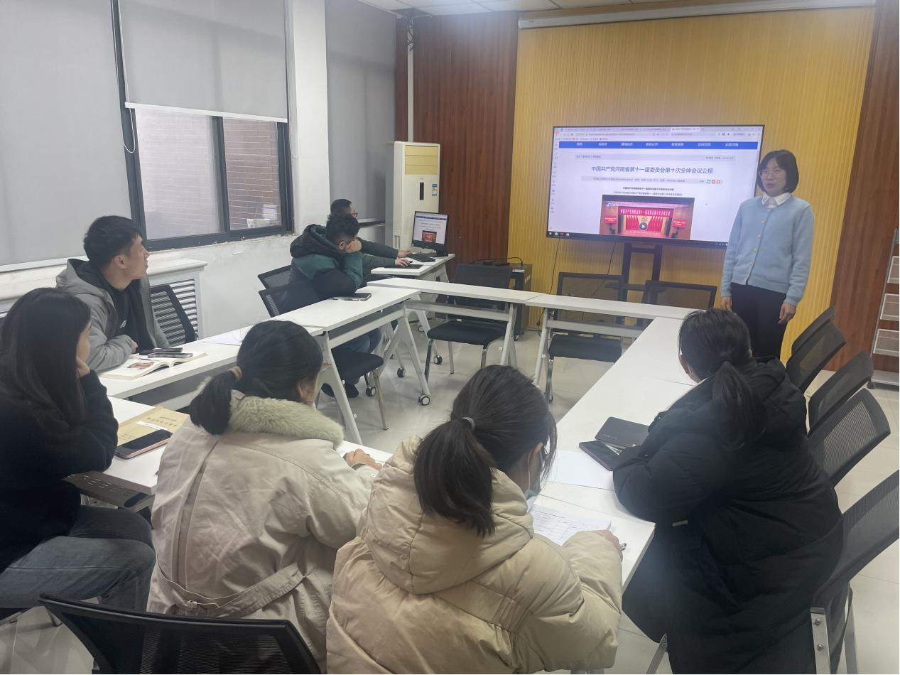 会上,党支部书记苗莹莹带领全体党员集中学习了《党的二十届四中全会<建议>学习辅导百问》、《习近平谈治国理政》第五卷的理论内容。苗莹莹同志强调,习近平新时代中国特色社会主义思想是一个系统完整、逻辑严密的科学理论体系,我们要原原本本学、深入思考学、联系实际学,深刻领会其核心要义、精神实质、丰富内涵和实践要求,不断增进政治认同、思想认同、理论认同、情感认同。在学习讨论环节,支部成员踊跃发言,结合河南作为农业大省、文化大省的省情,以及自身在教育教学、科研创新、学生管理等方面的工作实际,畅谈对“构建新发展格局、推动高质量发展”的理解。安雷雷谈到,要将全会精神融入到日常的课程思政建设中,引导学生深刻认识国家发展战略,培养学生服务地方经济社会发展的责任感和使命感;龚宪宇提出,在科研工作中要聚焦国家重大需求和河南产业发展方向,积极开展关键技术攻关,为河南构建现代化产业体系贡献智慧和力量;黄敏杰表示,要以党的自我革命精神为指引,不断加强自身党性修养,严守纪律规矩,在工作中发挥党员的先锋模范作用,以过硬的作风保障各项工作落到实处。大家一致认为,通过本次集中学习,进一步提升了理论素养,明确了工作方向,今后将以更加饱满的热情和更加务实的作风,投身到学校各项事业发展中,为服务河南高质量发展、谱写中国式现代化建设河南篇章贡献支部力量。