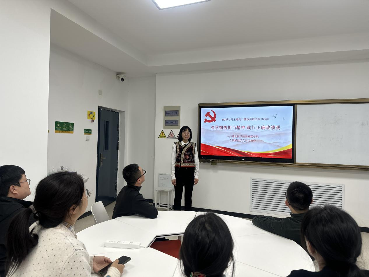 3月25日下午,基础医学院人体解剖学党支部在励学楼A105开展以“深学细悟担当精神,践行正确政绩观”为主题的党日暨政治理论学习活动。支部全体党员参加会议,会议由党支部书记苗莹莹主持。