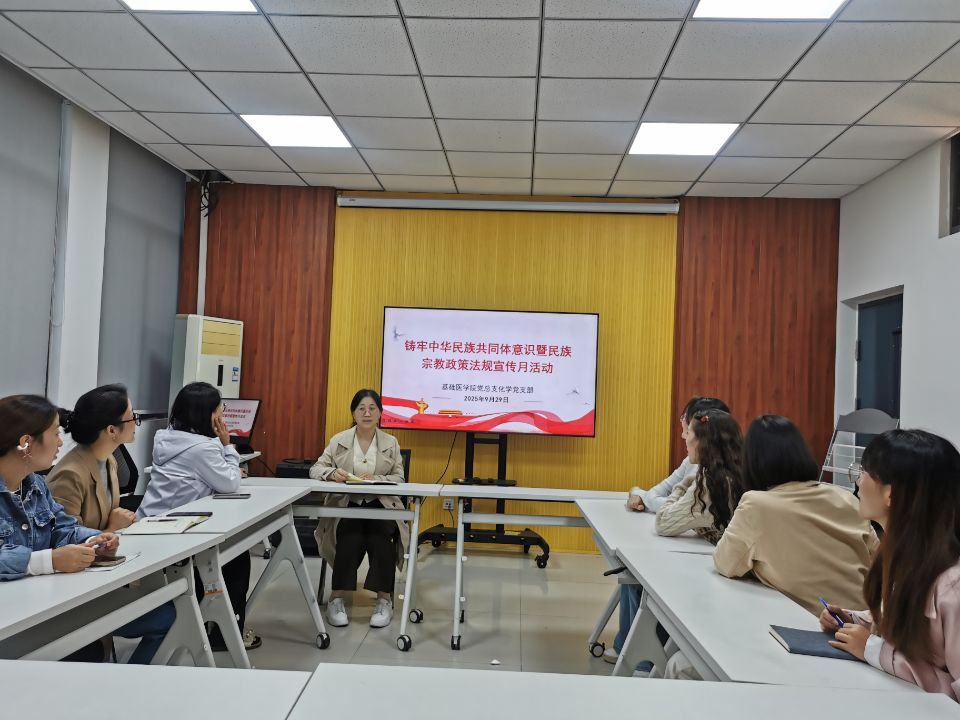 为深入贯彻落实学校党委关于民族宗教政策法规宣传月活动的工作部署,9月29日下午,人体解剖学党支部以深化政策学习·筑牢思想防线为主题,组织开展宗教政策法规专题学习培训。支部书记苗莹莹主持会议并作专...